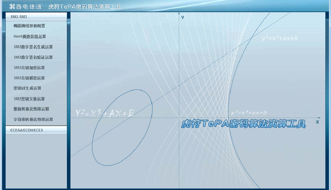 虎符TePA密码算法演算工具运行于Windows操作系统环境下,提供了友好的GUI用户操作界面,方便用户操作。基于ECC算法的椭圆曲线参数配置支持四种模式,192bits和256bits曲线配置模式可填入Fp素数域的任意曲线值,为用户提供极高的灵活性,WAPI曲线和SM2曲线配置模式为固定参数,用户无需输入复杂的曲线参数,一键获得参数,为用户提供高效的易用性。执行基于ECC算法运算前,首先需要完成椭圆曲线参数配置,此类算法包括SM2签名、SM2验证、SM2加密、SM2解密、SM2密钥交换、ECDSA签名、ECDSA验证、ECES加密、ECES解密、ECDH密钥交换、密钥对生成、摘要运算、整数转换比特串和字符串转换比特串等。